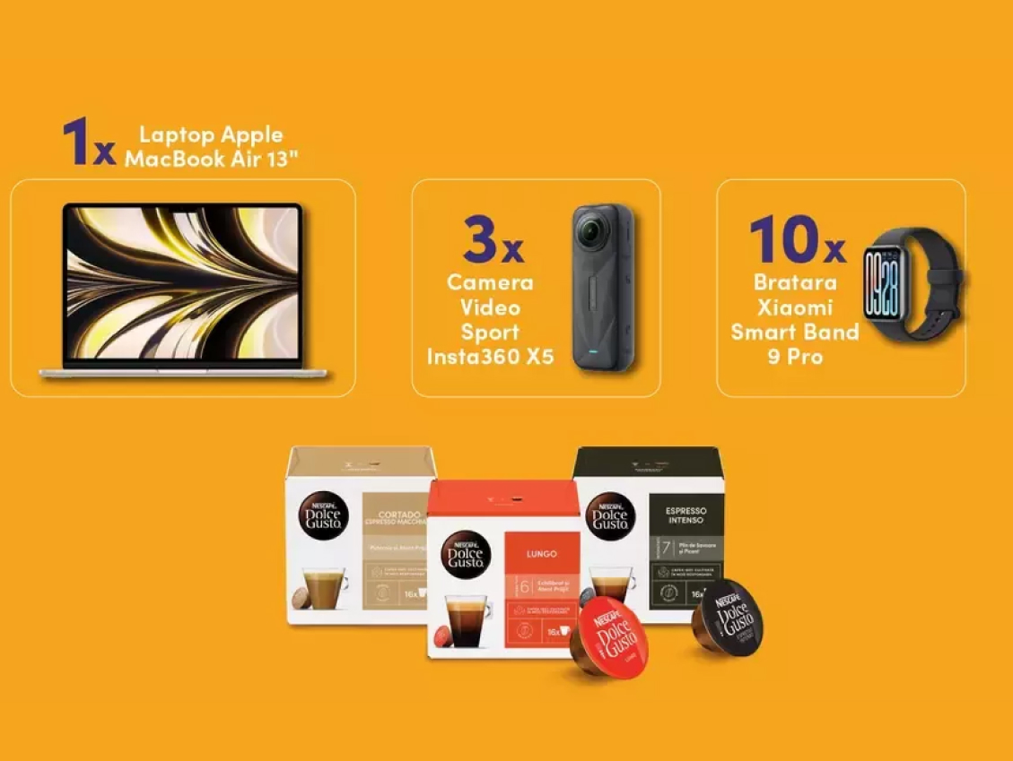 Poți câștiga un laptop Apple MacBook Air 13 M4, 3 camere video sport Insta360 X5 sau 10 brățări fitness Xiaomi Smart Band 9 Pro.
